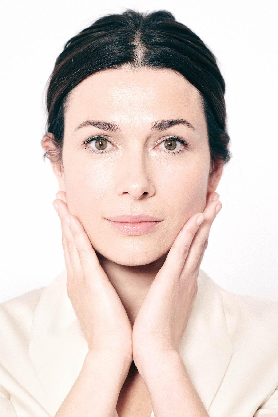 直接将产品以 V 字形轻轻在干燥脸颊上按摩,由下到上,由内到外。